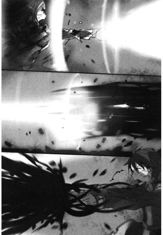 桐人骤然睁开黑色的眼睛,双眸沐浴在压倒性的意志力中熠熠生辉。明明是在如此绝望的状况中,他咏唱出最后一句咒文的声音,依然充满着无可动摇的决意。