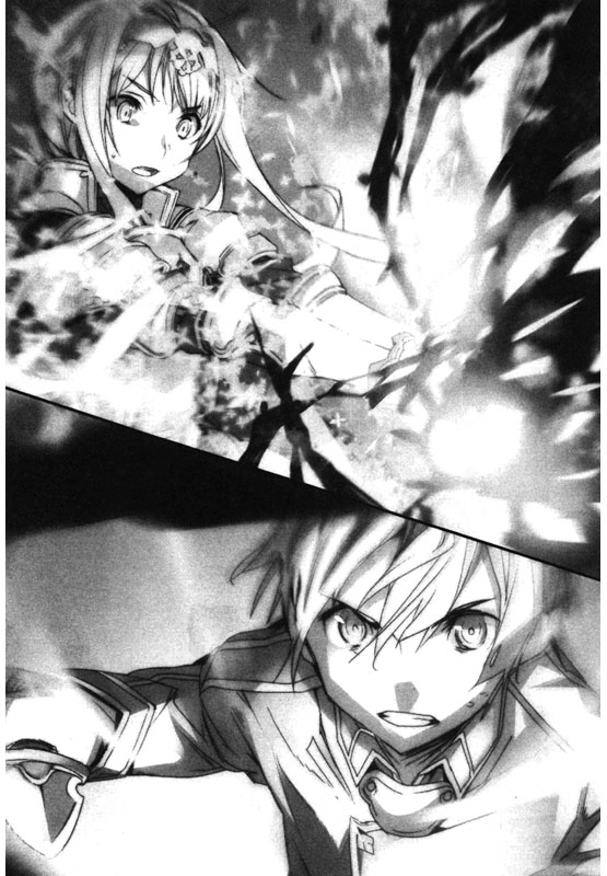 像水晶原石那样有著数个表面的透明冰柱,静静地把剑士两人困在内部并闪闪发光。穿透出来的是爱丽丝的右手,和握着的金木樨之剑,剑尖仍然插在墙壁里面。在碧绿的冰中,爱丽丝的脸微微一惊,桐人的脸上则带着决死的觉悟,各自静止著。