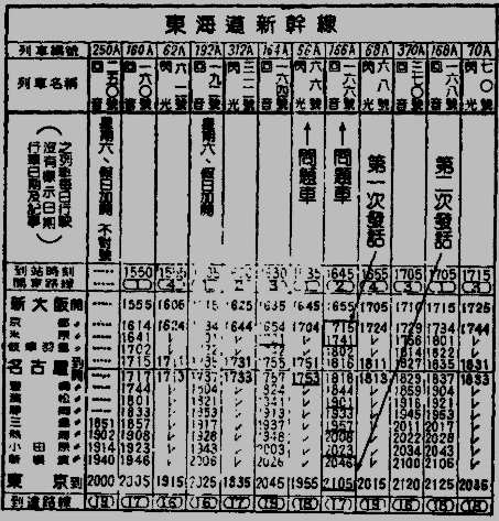 “既然如此,没关系,反正我知道自己会被怀疑。那天我坐的是回音号,我到筹备会去,为万国博览会的企划进行最后的协商,回来的时候坐这班车。是四点五十五分由新大阪开车的同音一六六号。你们所问的时间,应该正在滨松和三岛之间,对了,拿时刻表来看比较容易了解。”冬本轻巧的站起来,从办公室拿来新干线的时刻表。