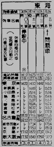 “其他下行的回音号,十七时二十二分不在名古屋,而且都不能满足赶上闪光六六号的条件,所以冬本一是搭乘回音一五三号。冬本在这一天下午两点钟左右离开大阪,所以可能坐上行的回音号回到东京。从这个角度来看当天下午两点以后,从新大阪开出的回音号时,从十四时十五分开的回音一五○号开始,有三六六号、三九四号、一五四号、一五六号等五班车。这些班车都在下行回音一五三号到达丰桥以前到达该站。冬本一定是坐这五班上行车其中的一班回到丰桥,在这里转换下行的回音一五三号,然后再发出第一次通话。”佐野的声音充满信心。
