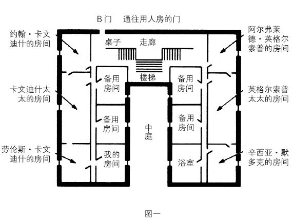 从用人房出来要经过B门,而且和英格尔索普夫妇所在房间的右侧并不相通。