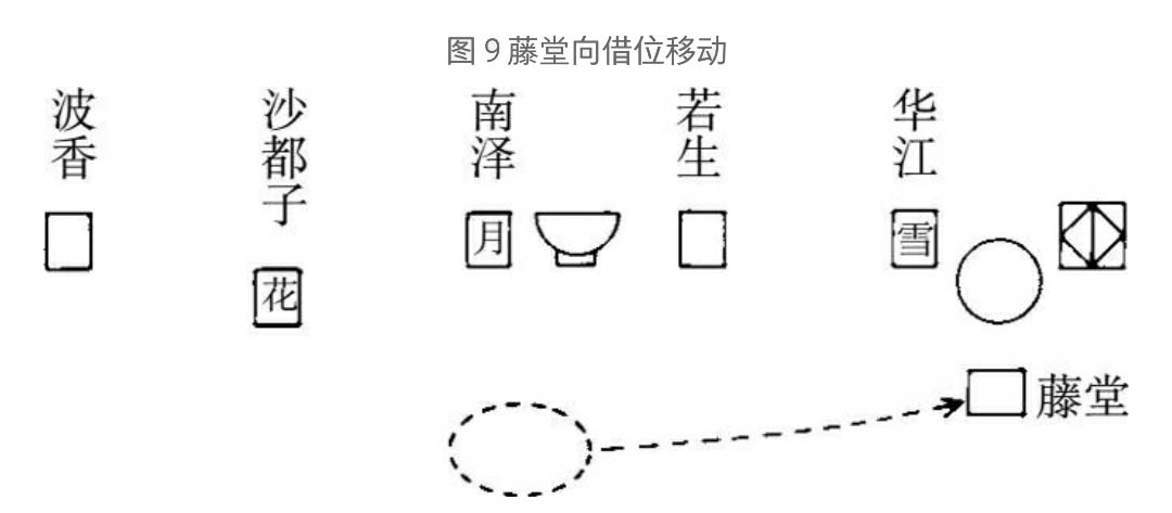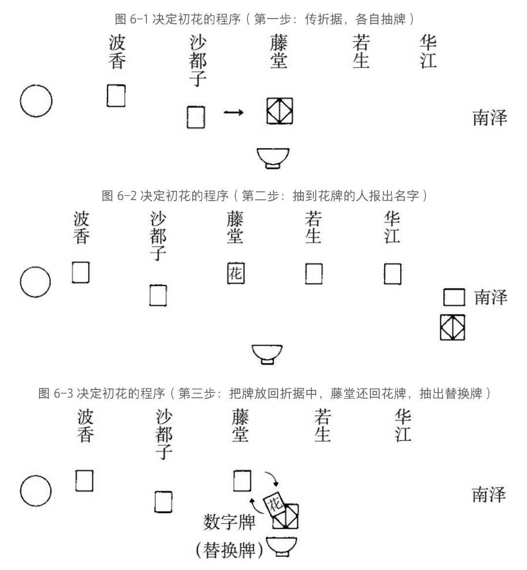 沏茶座上的藤堂拿着替换牌站起身,长出了一口气,像是因为第一个抽到“花”而特别紧张。他顾不得施礼什么了,像是逃跑一样坐在了末座华江面前。他坐的这个位子被称作“借位”,是“花”任务结束后等待下一轮抽签的地方。(图9)