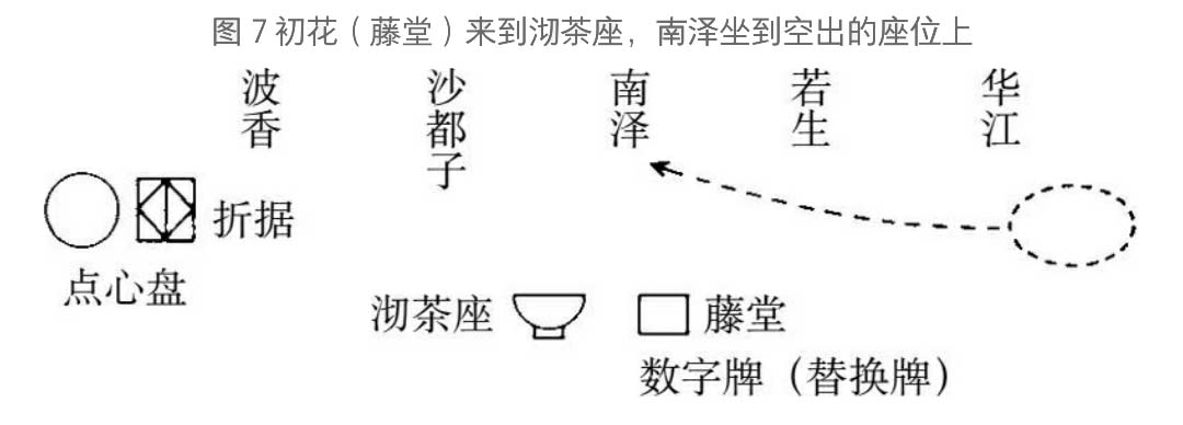 按规矩,此时亭主要坐到初花的位子上去,即南泽雅子要坐在藤堂原先的位子上。(图7)