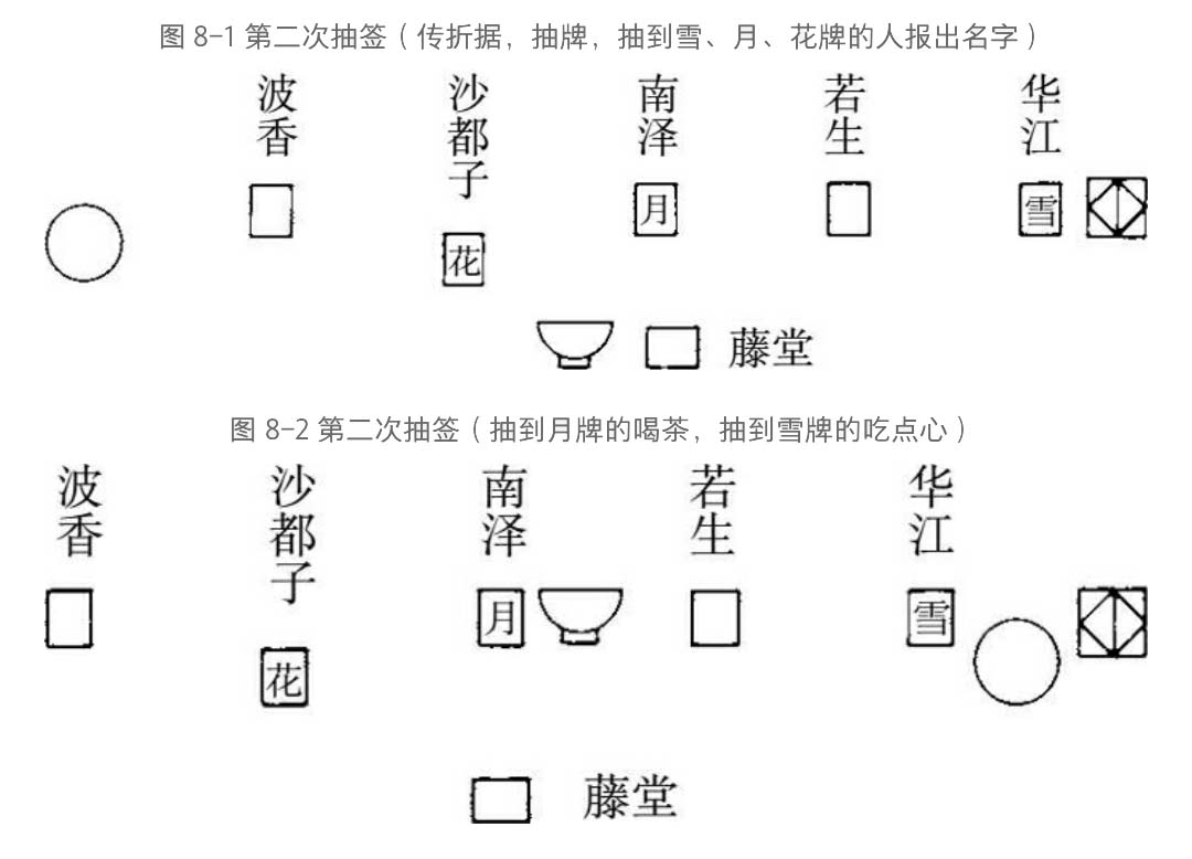 沙都子一旁的南泽把“月”放下,右脚先起,站起来端过了茶,又左脚先落,端坐着喝茶。同时,点心盘也从主客波香那里传到了华江手中。(图8-2)按规矩,抽到“雪”的人要吃点心。