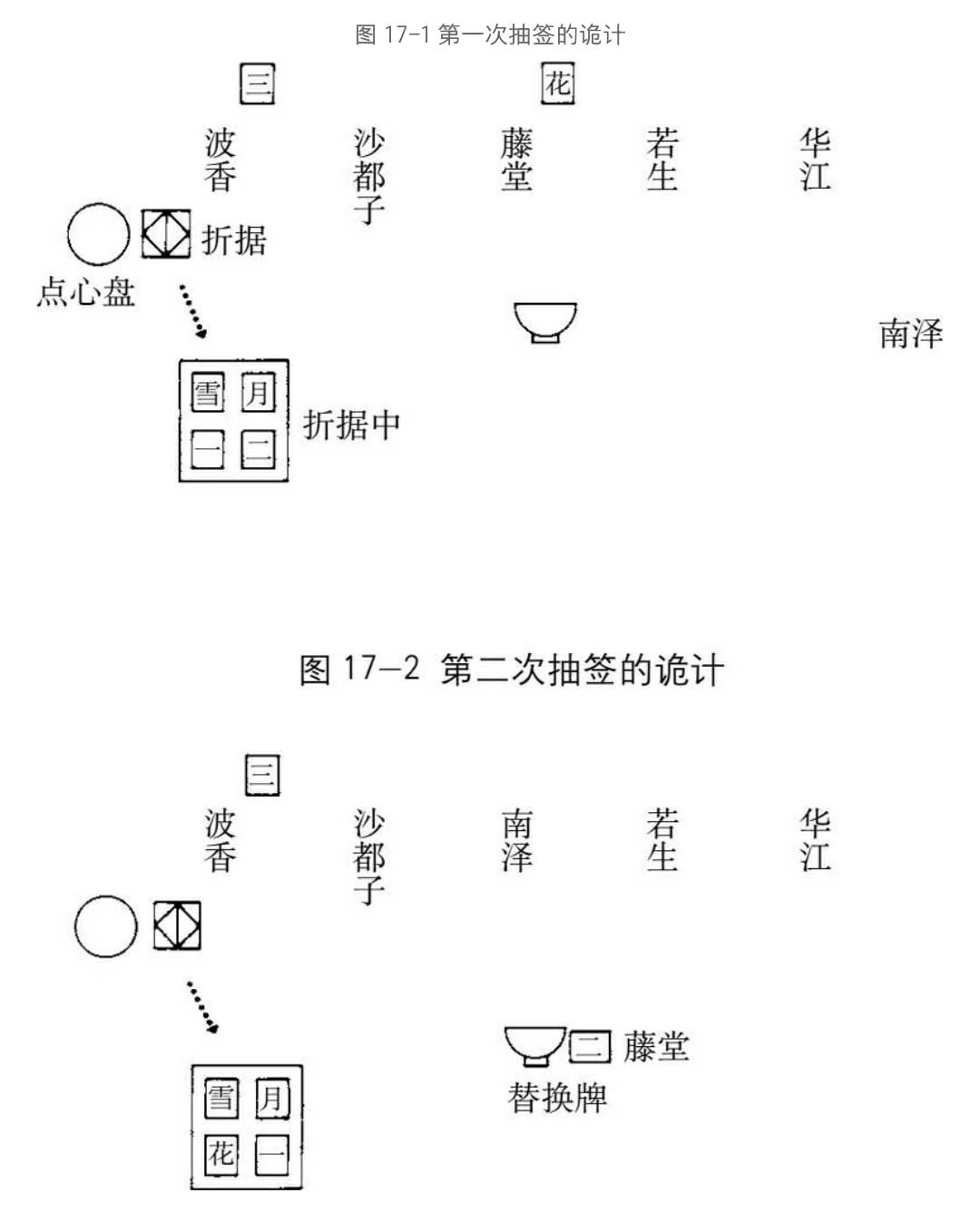 “这时,折据里的牌变成了‘雪’、‘月’、‘花’和一张数字牌,总共四张。折据就在你、老师、若生和华江之间传递。若生抽到数字牌的概率只有四分之一。但不难想象,从波香的目标来看,即便是华江抽到也没关系。只要若生和华江之中有一个砷中毒,他们便不能参加第二天的比赛,也就达到了波香的目的。于是概率就变成了二分之一。整个骗局中,应该只有这个环节是在赌运气。如果你或老师抽到了数字牌,他们的计划就会中途作废。”