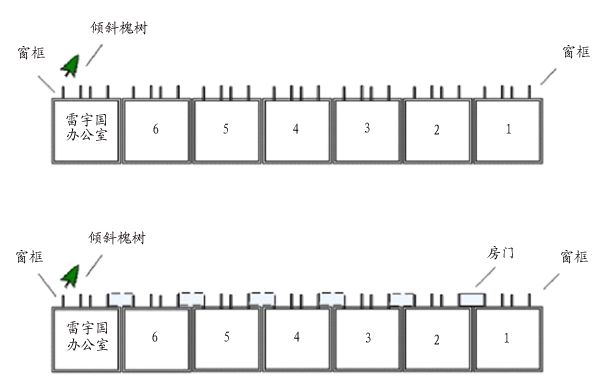 “请看,上面这排是没有使用半扇房门的示意图,下面是使用之后出现的情况。图中1号房间的门是开着的,其余全被锁上。叶秀珍B只需进入1号房,借着房门的帮助,来到2号房,再把房门搬下来,搭在通往3号房的‘窗梯’上,以此类推就来到了雷宇国的办公室。窗台上布满了灰尘,所以她不会选择窗台为落脚点,而是踩在了屋内的板床上。先前张爵明已经将凶器带走了,但她曾躲在暗处目睹了一切,清楚凶器是一把水果刀。叶秀珍B将她从厨房拿来的凶器重新插入致命的伤口,特意留了半截刀身,以此陷害潘少强A。完事后,她把门打开回到自己的房间。我承认,这确实是一种麻烦的方式,但它也是叶秀珍B唯一能进入犯罪现场的方法,这样的机会她不会错过。”