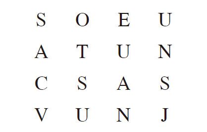 “变混沌为有序,”兰登说着,牵动一边嘴角露齿而笑,“恰如你哥哥的承诺。”他从口袋里掏出一张纸,上面是刚才从共济会密码中得到的字母格。“刚才,这个字母格毫无意义可言。”他把它摊平在桌上。