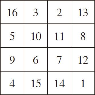 “说得对,”兰登说,“但你知道这个幻方为什么闻名于世吗?因为这个幻方看起来不可能实现,但丢勒做到了。”他用手比画了一下,向凯瑟琳展示:不止是纵向、横向、两条对角线相加为三十四,丢勒还成功地做到了四个象限、四个中心方块、甚至四个角上的方块里的数字相加都是三十四。“更让人惊叹的是,丢勒还有办法把十五和十四这两个数字嵌入底层数列,暗示他是在一五一四年完成的这项不可思议的杰作。”