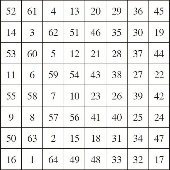 “你需要一个八乘八幻方!”教授是这样喊的,仅剩下嘴唇还在水面上。“幻方是以级数(order)归类的!三级乘三级就叫‘三阶幻方’!四级乘四级就叫‘四阶幻方’!你需要一个‘八阶(ordereight)’的幻方!”