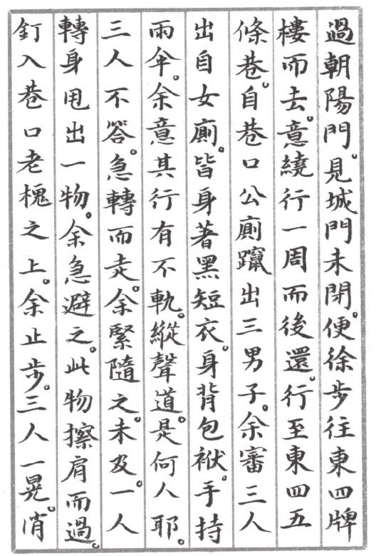 走过朝阳门,发现城门还开着,我便继续往东四溜达,打算绕一圈再回去。走到东四五条,胡同口的公厕里钻出三个男人。我一看,是从女厕所出来的,三人都穿黑短装,背着包袱,一人手里拎着把雨伞。