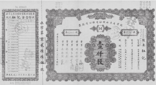 自来水厂创办之初,为了筹钱建厂,发行了300万元股票,分30万股,每股10元。公司规定股票不接受外国人投资,中国人不论什么身份,都能入股,并且都能享受股东权利。因为自来水用户增长缓慢,在早期的经营期间,自来水厂一直亏损,股东红利发放非常缓慢