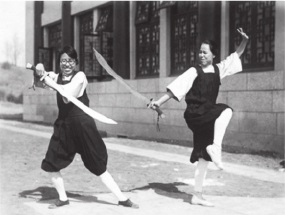 民国中后期,薛天的理念得到推崇,武术界广泛掀起了国术救国的运动,当时的中国可以说是武馆林立,各路门派都希望将自己的功夫发扬光大。图为1928年燕大女生在表演武术