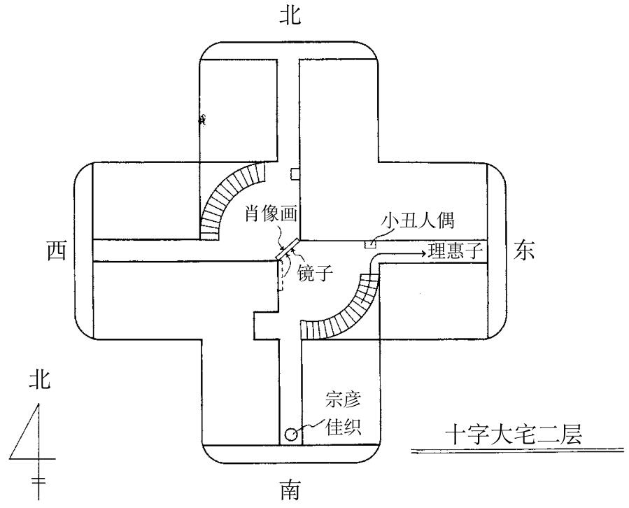 “如果直线看过去,的确如此。但要是在这里——”悟净说着在草图上的走廊交叉处画了一条线,说,“要是在这里安上一面镜子,从佳织小姐的房门外看到的就是东侧的阳台,而看似是北侧的楼梯,其实是东侧楼梯。”