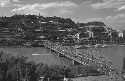 但是,汽车只此一班,所以我们没有时间游览五泉公园,更没时间游览白塔山公园。白塔里存放着13世纪于此地去世的西藏喇嘛的遗骨。但是白塔山公园值得一看的不是白塔,而是从白塔山上可以眺望的美景。从旅游宣传册的照片上看,白塔正好俯瞰临近庙宇的瓦顶,以及远处有“天下黄河第一桥”美称的兰州黄河铁桥的英姿,还有河水激起的朵朵浪花。后来我们才知道,原来不用去白塔山公园也可以欣赏到如此美景。我们乘坐的汽车先穿过铁桥,然后爬上塔后的山坡。从车窗里,我们就可以俯瞰临近庙宇的瓦顶、铁桥的英姿,以及河水激起的朵朵浪花。