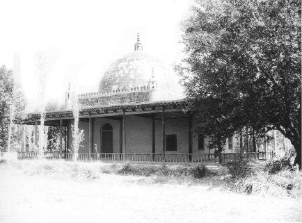 我们骑上自行车,又蹬了一公里,来到另一个墓地群——这个是有围墙和大门的。这里是这一地区最神圣的地方,也是穆斯林举行重大节日庆祝活动的地方。届时上万名信徒赶来参加活动,其中的五千多人要设法挤进墓地群中的清真寺。这里很久以来就是个神圣之地。四周的田野长满了胡杨,遍布着千万座坟墓,其中最重要的墓要数位于清真寺外面的那两座。一座由整块巨石建成,墓顶的瓦片大多掉光了;另一座为新建的土木结构。两座墓的主人都是1700年至1930年间统治哈密地区的回王。