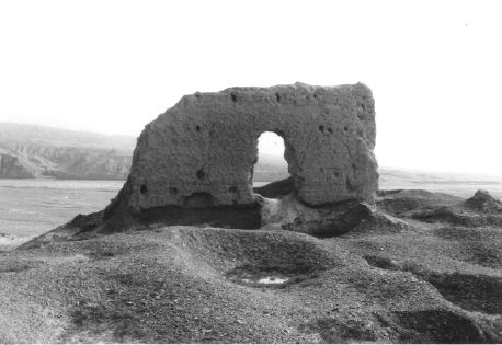 苏巴什的古城墙是丝绸之路上除吐鲁番郊外的高昌故城和交河故城之外最壮观的遗址,也是人们最容易接近的地方,但我们还是需要乘吉普车才能到达这里。既然我们租了一整天的车,我们便接着往前开。离开苏巴什,我们的下一站是位于库车县城西北的一座孤寂的烽火台,从台上可以俯瞰另外一条河。与库车河不同,这条河是一条干涸的、由结晶盐形成的河流。暴雨将附近山中的结晶盐冲刷下来,带到了河床中。烽火台建于3世纪,目的是扼守通往山中的路,也就是我们头一天进城走的那条路。烽火台有15米高,支撑顶部瞭望台的木柱子仍在原地。土墙脚下的一个牌子上标有此处的名字——克孜尔尕哈土塔。维吾尔语中,“克孜尔尕哈”有“女儿不要死”之意。
