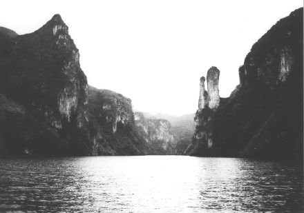 船一离岸,我们都把头抬到刚刚能从船边望出去的高度,看到高高的崖壁上有一座天然的石桥。风接着又逼得我们趴下来。接下来的一个小时里,我们的船顺流而下,而我们什么也顾不上看了,只顾着自己冻僵了的四肢。据我们的导游讲,我们的船正在峡谷中穿行,峡谷约有100米宽,200米高,两岸有瀑布和岩洞点缀其间,还有各种各样奇形怪状的岩石。船行大概5公里后,我们来到一座形状酷似孔雀的巨型石峰下面,这里是游船下行的终点。所有人抬头看了一眼,立刻又恢复到胎儿的姿态,船调过头来往上游方向驶去。每个人都知道,上行的游程与下行的游程是一样的。我们所遭受的煎熬,却因为一次临时的停靠得到了些许缓解——船停靠在一个僻静的水湾内,十年前这里作为保护区被立法保护起来,其中也包括这里的树。船停下来是要有执法活动。