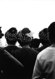 到曼坡寨之后,我经过一群当地妇女的身旁,她们正在卖各种各样的熟食,大部分是油炸的或是糯米做的。我停下来,享用了一些美食,然后穿过小吃摊,加入了围拢着两组舞蹈队的人群。每个舞蹈队都围成一个成对的圈子,姑娘在里,小伙在外。一队是已婚男女,另一队是未婚男女。圈子的中央是敲锣打鼓的乐队,略显笨拙的男人和身姿优美的妇女组成圈子围着乐队缓慢移动,往前走三步,再往后退一步,如风中杨柳般挥舞着双手。