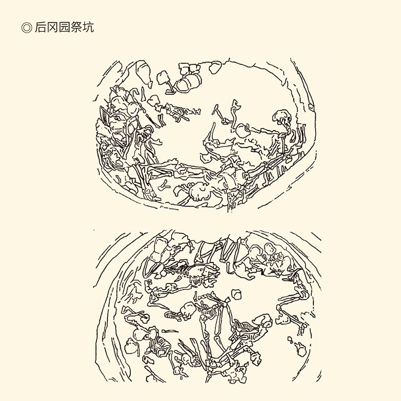 位于河南安阳高楼庄村,隶属商后期都城遗址。坑内共发现七十三具个体,分埋成三层,各层人数不一。经鉴定,所埋人骨大部分是男性青壮年及儿童,少数是青年女性及婴儿。图为祭坑第一、二层。