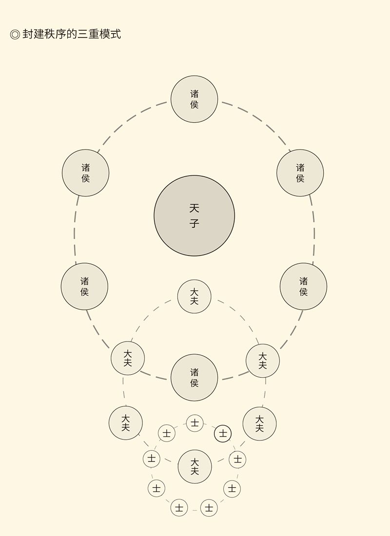 如图所示,“封建秩序”表现为三重模式的众星拱月:家臣们(士)围绕着家君(大夫),大夫们效忠于各自的国君(诸侯),诸侯则拥戴那至尊至强的天子(共主),秩序井然。