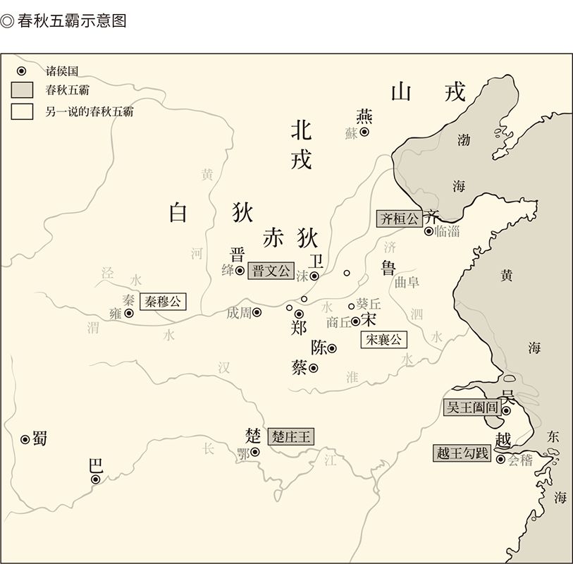 这七个人,宋襄公其实不能算数。剩下的六个,前三后三。前三,齐桓、晋文、秦穆,都在北方;后三,楚庄、阖闾、勾践,都在南方。因此春秋的争霸可以分为两段,前半段是北方的时代,后半段是南方的时代。[3]