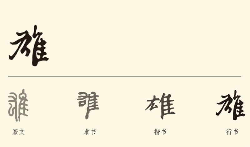 雄,形声字。本义是公鸡,泛指雄性动物。隹表意,篆书字形像鸟,表示公鸟。厷表声,厷是肱的本字,有孔武有力之意。表示雄性鸟或动物比雌性勇健。