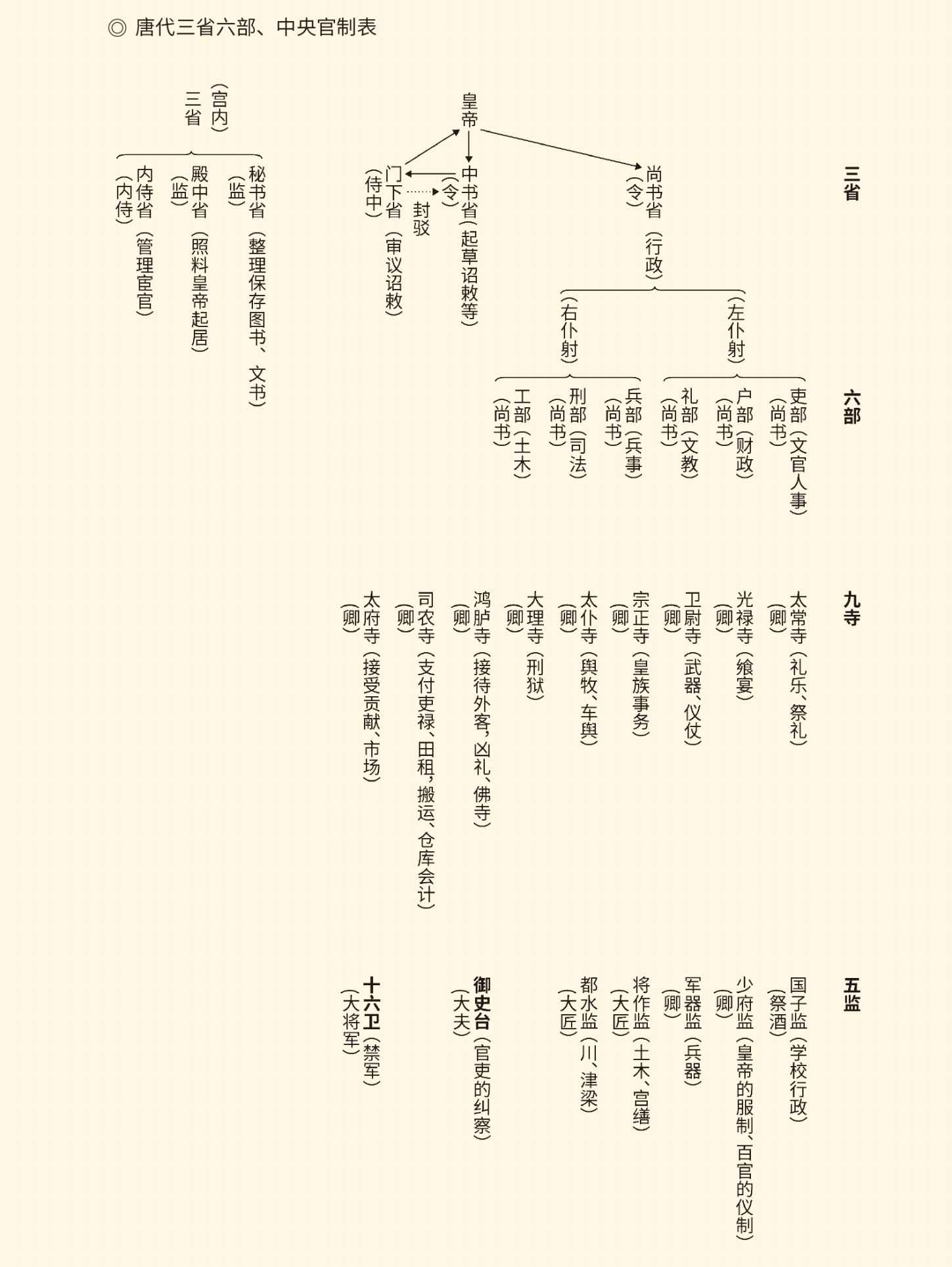 尚书省的规模也最大,下辖六部二十四司。其中,吏部管官员,相当于组织部或人事部;户部管度支,相当于财政部兼民政部和商务部;礼部管祭祀和教育,相当于文化部兼教育部再加精神文明建设办公室;兵部管军政,相当于国防部;刑部管刑律,相当于公安部和司法部;工部管营造,相当于建设部兼交通部、农业部、水利部。