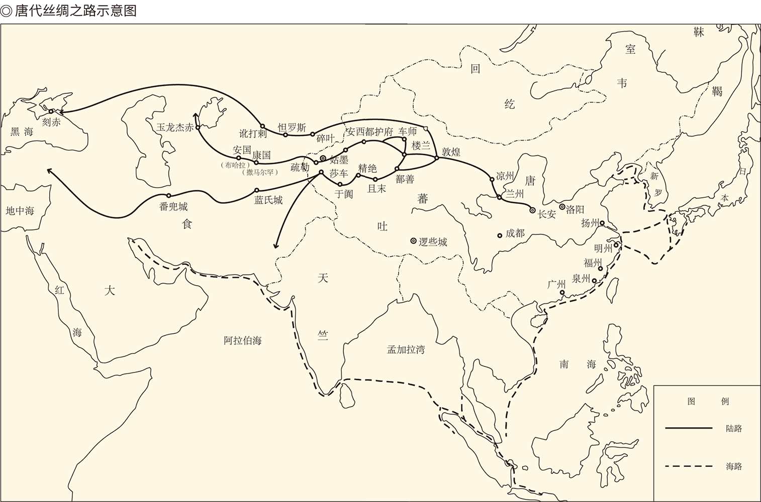 但是没有办法。两害相权取其轻,朝廷只能采纳郭子仪的建议,联合回纥,对抗吐蕃。对此,回纥态度积极,改名回鹘(鹘读如胡)以后也如此。因为他们跟吐蕃一样,都对天山之南那条翻过葱岭便可来到撒马尔罕(Samarqand)和布哈拉(Bukhara),最后抵达波斯和罗马的商道感兴趣。[43]