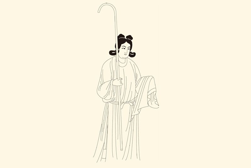 盛唐时期,敦煌第151窟北耳洞龛女像。少女头梳双髻,着圆领长袍,选自张大千临摹敦煌壁画。