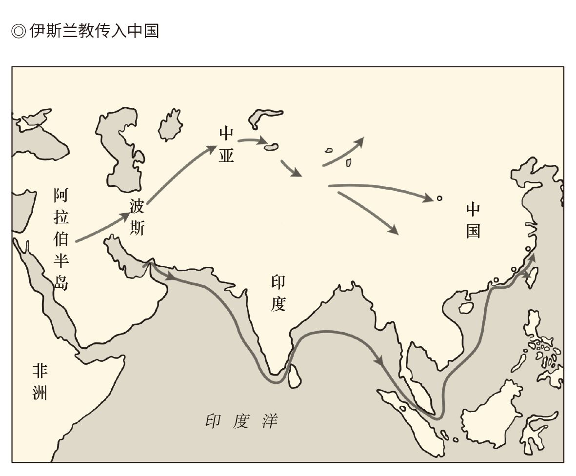 伊斯兰教在阿拉伯半岛兴起不久就传入中国,以唐、宋、元为主要时期。传播路线主要有两条:一是陆路,沿丝绸之路从阿拉伯经伊朗、阿富汗到新疆天山南北,再经青海、甘肃穿河西走廊到达长安;二是海路,从波斯湾和阿拉伯海出发经印度洋、孟加拉湾、马六甲海峡到广州、泉州、杭州、扬州等中国沿海城市。