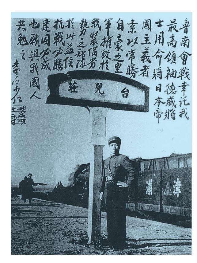 第五战区司令长官李宗仁战后在台儿庄火车站站牌下