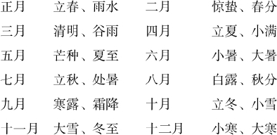 二十四节气是我国古代历法的重要组成部分。古人根据太阳一年内的位置变化以及所引起的地面气候的演变次序,把一年365.25日的天数分成24段,分列在12个月中,以反映四季、气温、物候等情况,这就是二十四节气。每月分为两段,月首叫作“节气”,月中叫作“中气”。二十四节气的名称和顺序为: