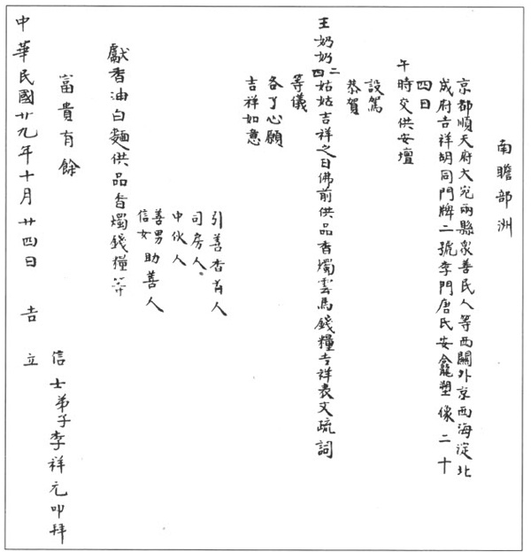 以上的表文须要说明:“引善香首人”便是被柬请并且助有香资供品的本门香头;“司房人”便是司账者;“中伙人”便是厨茶房人; 便是男女来宾;李祥元便是本家李香头。