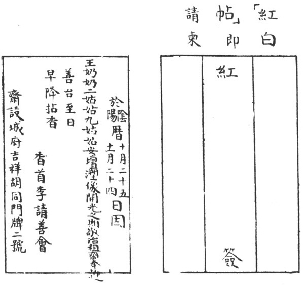 “请柬”:“安龛”的人家在典礼举行的前几天,要向亲友和本门各香头下请柬,名之为“请善会”。请柬的形状是白色封筒,中间黏着红签。因为是主人亲身送致,所以在红签上并不写所请者的名字。封筒内装“红单帖”,将请善会的原因、日期、地点都写在“帖”上,其形如下: