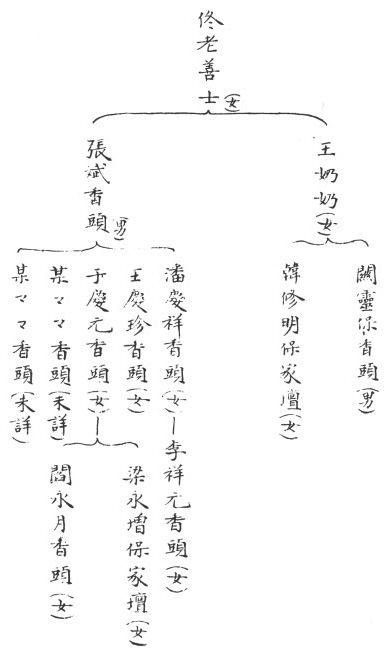 香头既然是师徒相承,自然便形成辈分的关系。现在可以用谱系法来表示海淀张香头门中各弟子的位置。