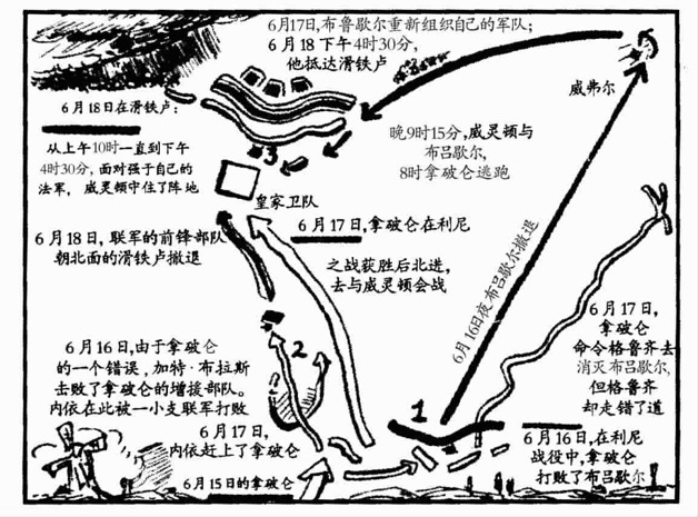 两天后,拿破仑在滑铁卢与威灵顿统率的军队遭遇。到下午2时,法军看起来似乎赢得了战争。下午3时的时候,东方的地平线上出现一股沙尘。拿破仑以为那是自己的增援骑兵部队,此时他们应该把英国军队彻底击败。到下午4时的时候,他才发现,原来是布鲁歇尔一边咆哮怒骂,一边驱赶着精疲力竭的部队进入战斗的中心。此举打乱了拿破仑部队的阵脚,而且他没有了后援部队。他只能吩咐部下尽可能保住性命,然后自己又逃跑了。