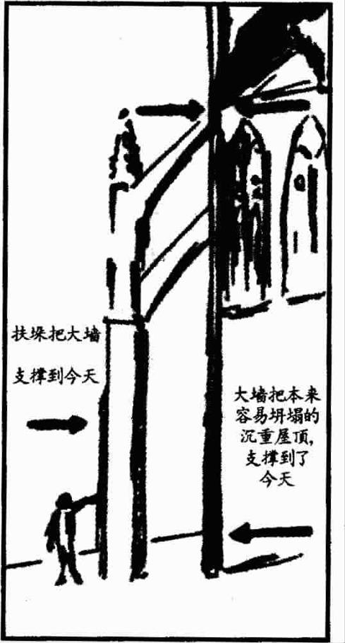 几百年来,建筑师们一直探索着如何建造空间足够大的建筑物。罗马的传统告诉他们,要建造厚重的石墙,上面开一个小窗,以免墙体承受不住自身重量而垮塌。可到了12世纪,十字军东征开始之后,欧洲的建筑师们看到了伊斯兰建筑的尖拱结构,受此启发,他们构想出一种新的建筑风格,使他们第一次有机会造出适合当时频繁的宗教生活所需的那种建筑物。然后,他们在被意大利人轻蔑地指为“哥特式”或“野蛮的”建筑的基础上,进一步发展这种奇特的风格。为了达到目的,他们发明出一种由“肋骨”支撑的拱顶,可是这样一个拱顶如果过重的话,很容易把墙壁压垮,个中的道理就如同一张儿童摇椅坐上了一个136千克重的大胖子一样,肯定会被压垮的。为解决这个问题,一些法国建筑师决定用大批沉重的石块来加固墙壁的支撑力,这样,制成屋顶的墙壁就可以靠在上边。后来,为进一步保证屋顶的安全,建筑师们又发明了所谓的“飞拱”来支撑屋脊。这是一种非常简易的建筑方法,你一看我的插图就会明白。