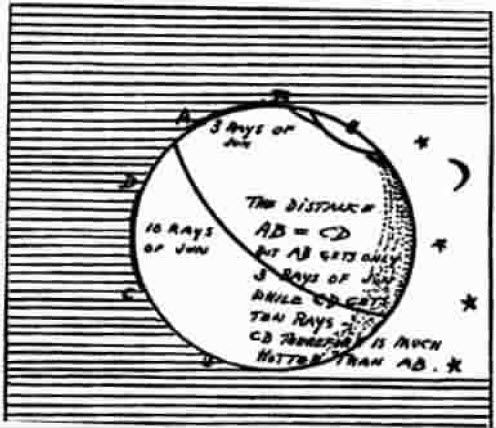 我们的“火炉”——太阳,在夏天要比冬天向地球发送更多时间的热量,而且夏天的阳光比冬天更炙热,所以夏天要比冬天热。不过,影响太阳作用的不止这些因素。在某一个寒冷的日子里,如果用小电热器在浴室里加热,你会发现浴室的温度很大程度上取决于那个小电热器摆放的角度。太阳也同样如此。赤道一带的阳光差不多是垂直地射在地球表面的。100英里宽的阳光几乎可以均匀地照射在100英里宽的非洲森林或者南美荒原上,它所有的热量差不多全部释放在这里,没有丝毫浪费。阳光在两极地区是斜射在地球表面的。一束100英里宽的阳光将覆盖两倍宽的地域或者冰壳上(插图将比长篇大论更能说明这个问题),因此两极地区获得的阳光热量就减少了一半。这就像一个可以使6个房间保持适宜温度的火炉要为12个房间供暖一样,其效果肯定会大打折扣。