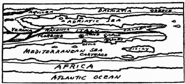 即便如此,坡廷格尔地图总的轮廓无疑是与罗马原图一样的。如果那张3世纪的原件就是罗马人的最好的地图,那么他们的地理知识还尚待完善。我在这里临摹了这幅地图,你可以自己评判一下。等你耐心仔细地研究过这张图后,你就能够清楚当年罗马地理学家的水平了。但是,你也要明白,对于当年那些要打到英格兰或者进军到黑海的罗马将军们来说,这个与意大利面条颇为近似的世界就是他们所能找到的最佳依据。从那时到现在,人类已经取得了多么巨大的进步。