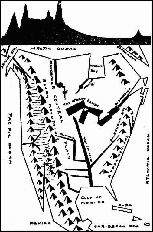 南北两个美洲的形状像两个三角形。唯一不同的是,南美洲的三角比北美洲的三角略偏东一些,这一点证实了一个事实:南美洲比北美洲更早被人发现。当南美洲已为人们熟知的时候,大部分北美洲的地区仍属于“未知的领域”。