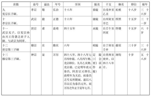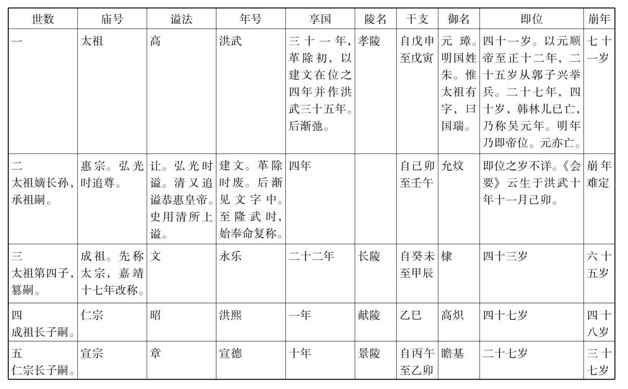 史家记载历代帝皇,有年号,有庙号,有谥法,有陵名。述史者举某一朝之事,任举其一端,或称年,或称庙,或称谥,或称陵。文法不一,所当熟记。又世次之先后,各帝即位之年,享国之数,及其干支之纪岁,任举其朝某事,一屈指而得其上下之距离,时代之关系,所谓知人论世不可少之常识。兹就明代历帝以表明之,冀便记忆。