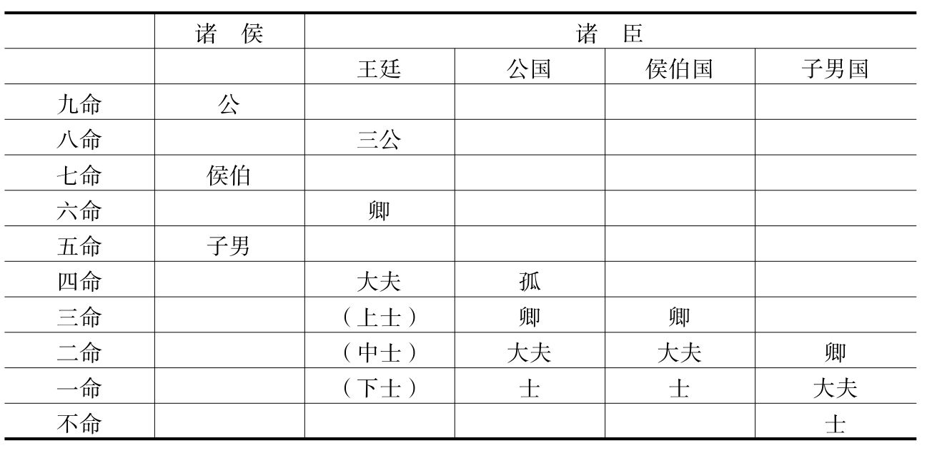 进一步观察,则对周代等级结构有两种说法。一种是天子、诸侯、卿、大夫、士,见于《左传》、《国语》、《礼记》等书。在此表述之中,天子、诸侯为君,卿大夫、士为臣。此外还有一种说法,即《周礼》“九命”。《周礼·春官·典命》:“上公九命为伯,其国家、宫室、车旗、衣服、礼仪,皆以九为节。侯伯七命,其国家、宫室、车旗、衣服、礼仪皆以七为节。子男五命,其国家、宫室、车旗、衣服、礼仪皆以五为节。王之三公八命,其卿六命,其大夫四命。”在这种说法中,公侯伯子男是“诸侯”,公卿大夫士是“诸臣”。前一种“天子、诸侯、卿大夫、士”的表述中,诸侯居诸臣之上;而“九命”结构与之不同,诸侯与诸臣做交错排列,而且天子诸臣与公侯伯子男国的诸臣,地位也不相同。参看下表:从此表观察,“九命”发挥了一种整合作用,即把诸侯、诸臣两个序列,以及天子与列国之臣整合在一起了,已略具“一元化多序列复式体制”之意。可以认为“九命”设想有“继往开来”的意义,它预示了未来帝国等级秩序的发展趋势。