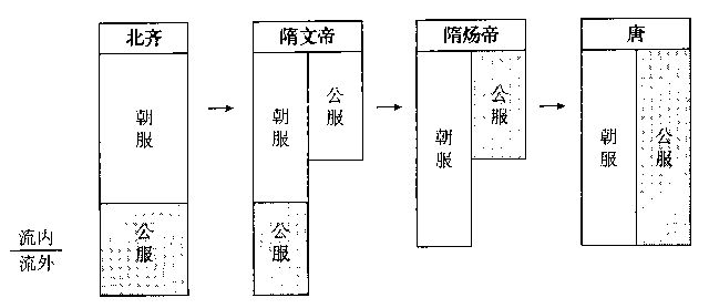 下面来看具服和从省服的形成过程。本来在北齐,七品以上用具服,八品至流外四品以上用从省服,就是说其时具服与从省服的区别,只基于“级别分等”的考虑,二者在结构上是纵向衔接的。隋文帝规定,从五品以上,除在陪祭、朝飨、拜表等“大事”场合用朝服外,“自余公事,皆从公服”。这样,“场合分等”明确化了,公服成了从五品以上官的另一套冠服,用于“自余公事”的场合。“服等”初现端倪。隋炀帝时,朝服的使用范围由七品以上扩展到了九品,成了所有品官的具服;从省服依然限于五品以上;同时随朝服向整个品官队伍扩展,流外官被排除在朝服使用者之外了(73)。这样“流内”和“流外”正式分成两大块,前一部分即品官明确表现为冠服体制的主体。到了唐代,从省服的范围也扩大到了九品官。“具服”与“从省服”两个服等,就是这样形成的。图示如下: