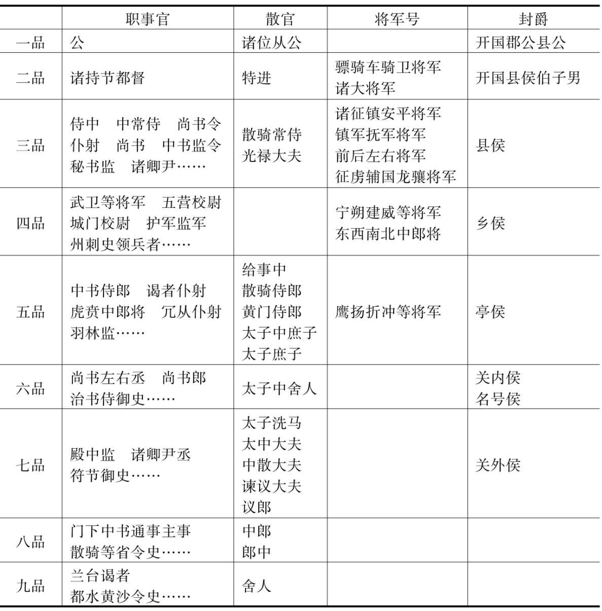 由此就可以看到,文武职事官、散官、将军号、五等爵与封爵,全都森然不紊地罗列于九品架构之内,它们都有了品级,由此一体化了。这就是九品官品的最突出特征之一。当然也有个别例外。如州郡县中正等构成的中正系统,因其职能与性质的特殊性,即,作为朝官之兼职、代表社会与民间“清论”,朝廷没有将之列入官品。