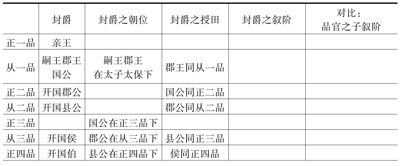 我们把封爵、朝位及其授田额度、叙阶待遇综合起来,列出下表: