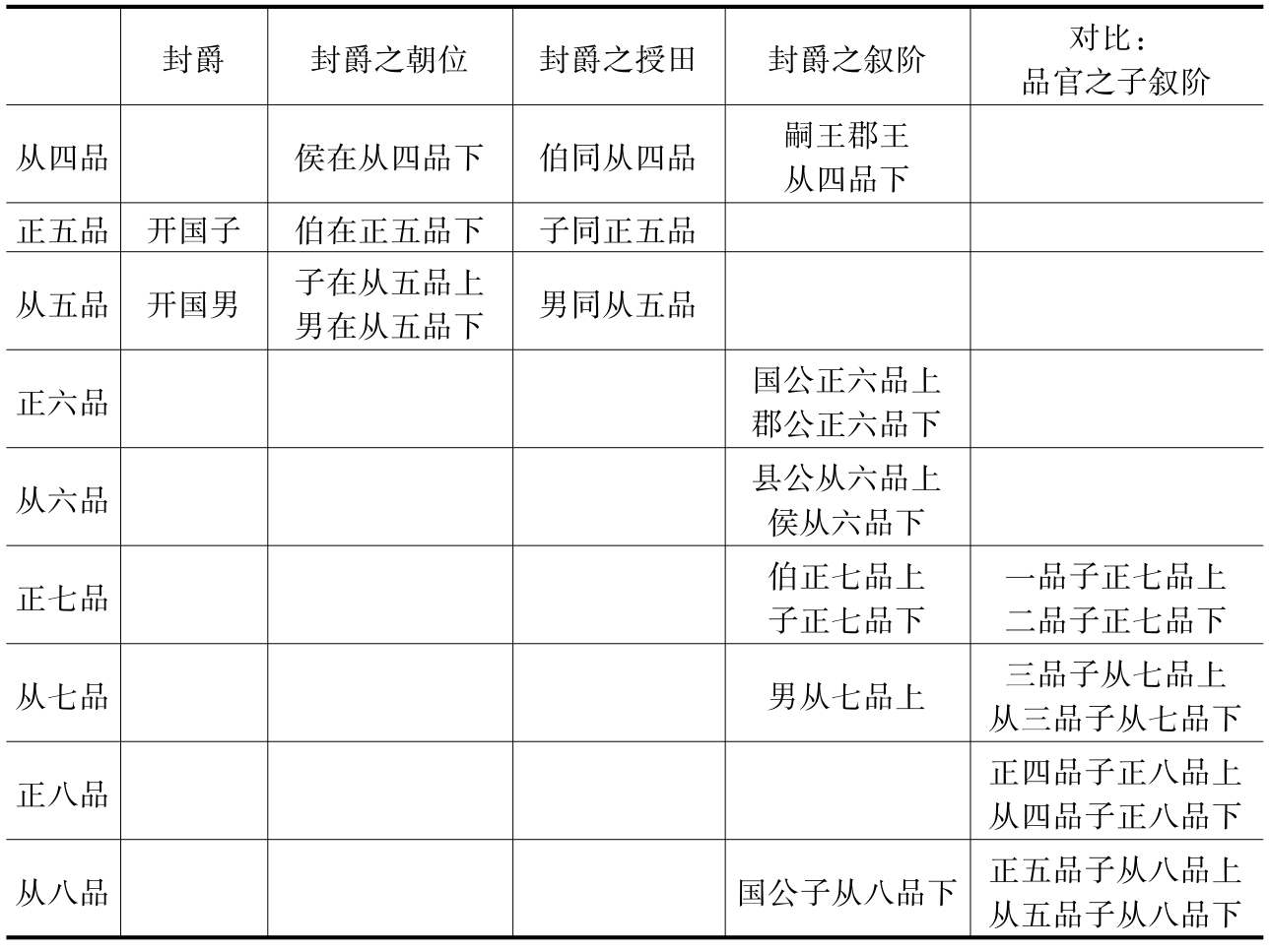 凡文武百僚之班序,官同者先爵,爵同者先齿。谓文武朝参行立:二王后位在诸王侯上,余各以官品为序。致仕官各居本色之上。若职事与散官、勋官合班,则文散官在当阶职事者之下,武散次之,勋官又次之。官同者,异姓为后。若以爵为班者。亦准此。其男巳上任文、武官者,从文、武班。若亲王、嗣王任卑官职事者,仍依王品。郡王任三品已下职事者,在同阶品上。自外无文、武官者,嗣王在太子太保下,郡王次之,国公在正三品下,郡公在从三品下,县公在正四品下,侯在从四品下,伯在正五品下,子在从五品上,男在从五品下。(中华书局1992年版,第33页)