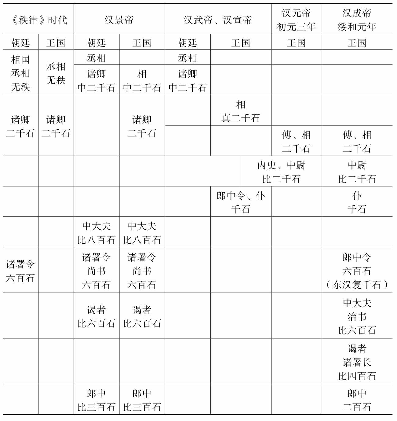 综合前面两节所述,从汉初到汉成帝为止,王朝官和王国官的秩级相对变迁,可以列如下表: