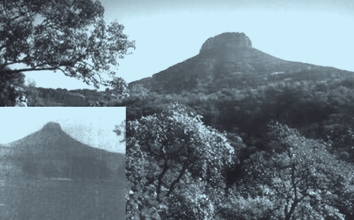 那座“山”名叫“抱犊崮”,在峄县、临沂、费县、腾县四县交界处,高约800米,是周围70多座山峰中最高的一座。崮顶平坦,有良田400余亩。当初为了耕种这些田地,需要耕牛。耕牛上不去,农民只能抱小牛犊上崮,养大后再使用,所以得名“抱犊崮”。