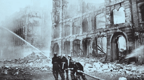 轰炸过后投入灭火的伦敦市消防员