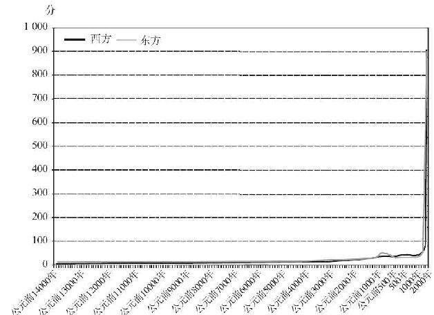 图2.5 公元前14000~公元2000年东方和西方社会发展得分(线性标尺)